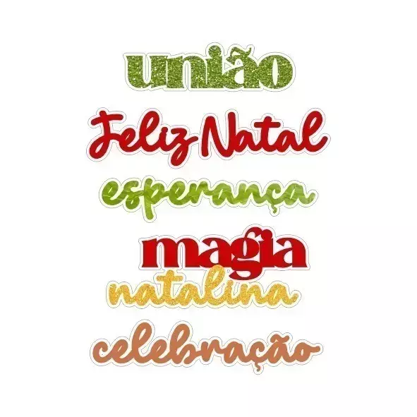 Títulos: União 1,5x6cm, feliz natal 2,1x8,7cm, esperença 1,4x7,6cm, magia natalina 3x7,3cm e celebração 1,7x8,1cm.