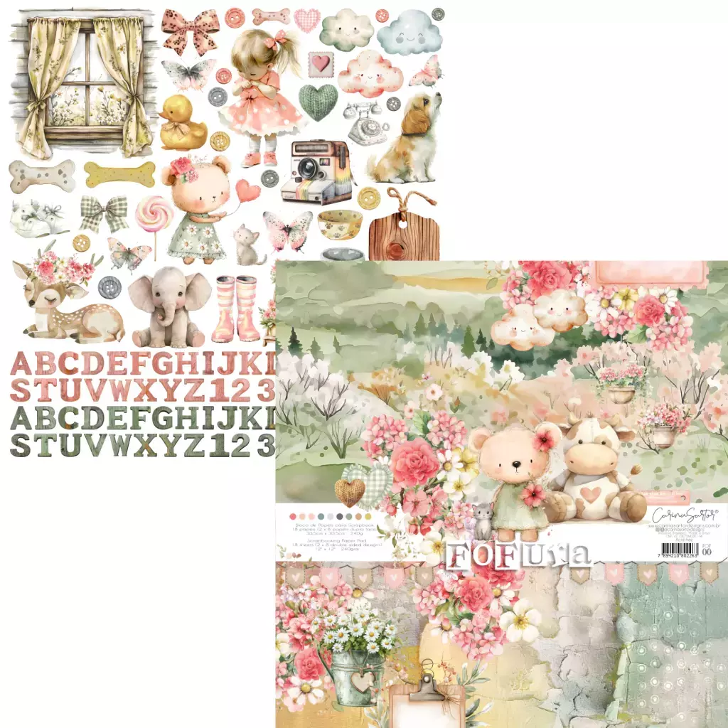 Bloco contendo 18 Papéis dupla face 30,5cm x 30,5cm / 12¨x12¨ - 240g2 folhas de cada da coleção (8 modelos - 16 folhas) e 2 folhas capa bônus recorte exclusivo para o bloco.