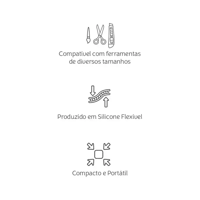 Com três suportes flexíveis em silicone, o Organizador de Mesa Mimo se adapta a diferentes tipos de ferramentas básicas, proporcionando um encaixe perfeito e seguro. Ele também tem um peso ideal para evitar que tombe mesmo com o uso de vários utensílios.