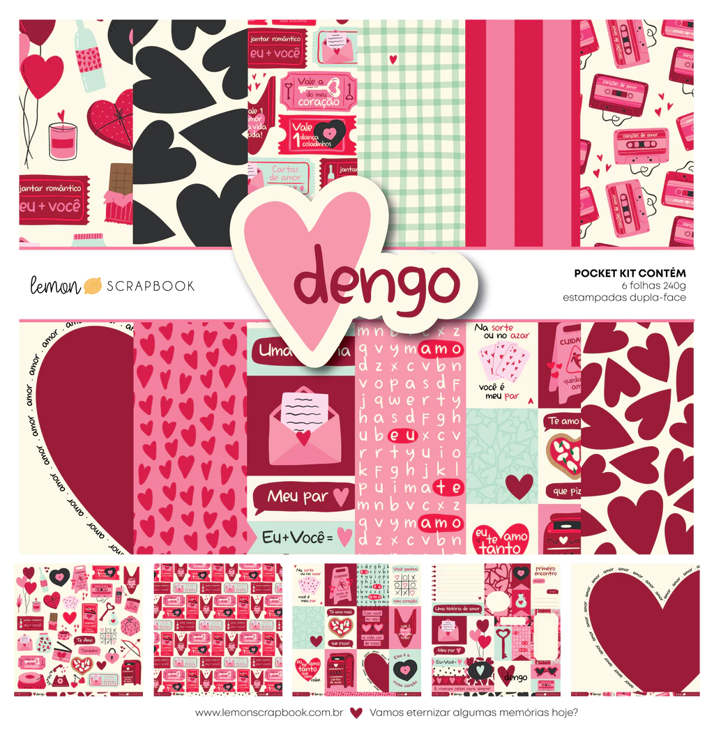 O Pocket Kit contém 6 folhas estampadas frente e verso da coleção de amor Dengo